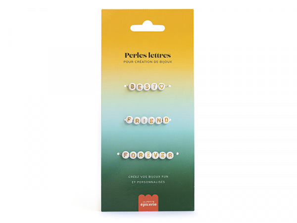Fabriquez des bracelets personnalisés à l'aide des perles lettres représentant les mots "Best", "Friends" et "Forever". Offrez un cadeau unique à l'occasion d'un anniversaire ou d'une autre fête avec ces mots associés à une perle cœur. La Petite Épicerie a sélectionné 20 termes et combinaisons différentes pour vous aider à créer des objets uniques, notamment "Sangria", "Spritz" et "Summer".