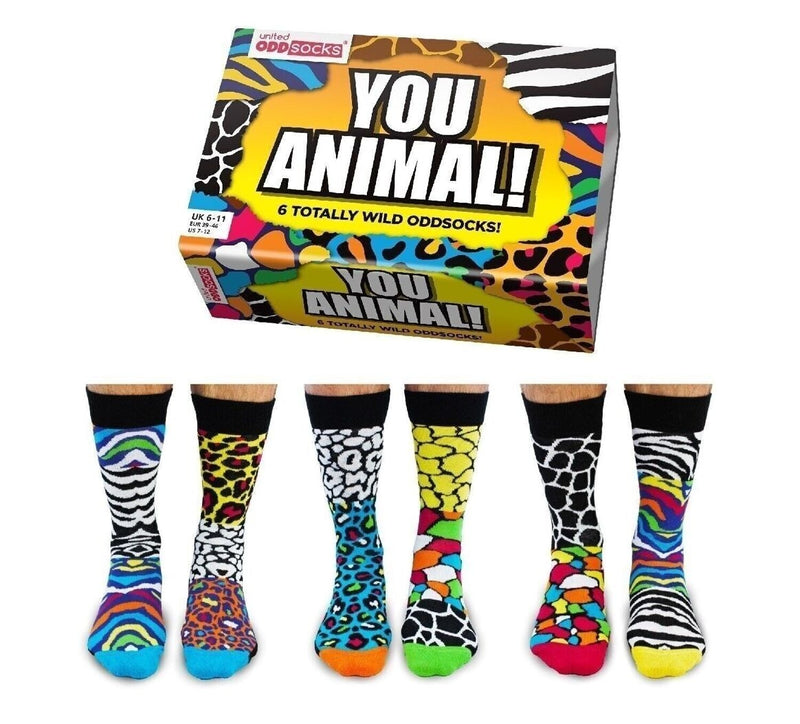 YOU ANIMAL ! | Coffret Cadeau 6 Chaussettes Impaires Imprimé Animal – United Oddsocks | Taille 39-46
