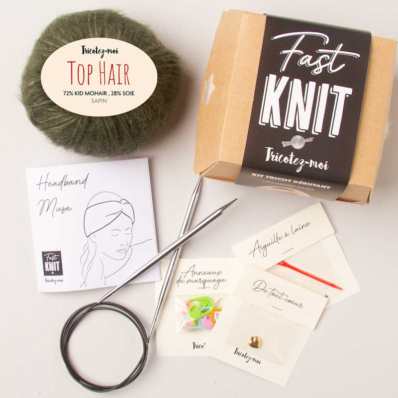 Die Fast Knit-Strickbox enthält alles, was Sie für die Herstellung dieses hübschen, sehr trendigen Stirnbandes benötigen: das Knäuel aus Mohair- und Seidenwolle, die Stricknadeln, die Wollnadel, Markierungsringe und das Strickmuster mit allen Erklärungen.