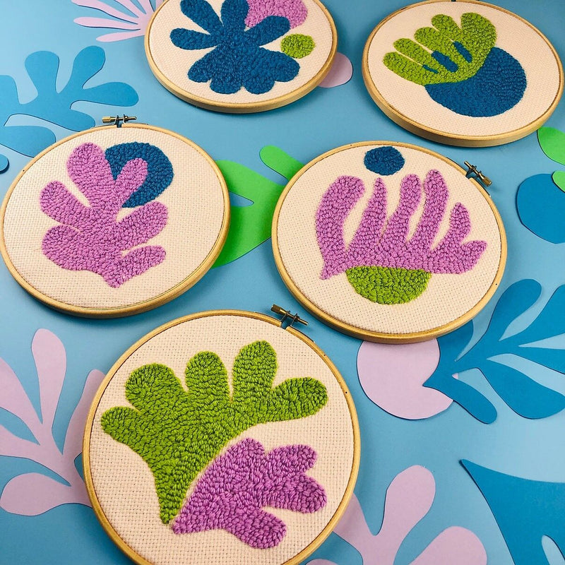 Punch Needle ist eine Art Stickerei, aber anstatt den Stoff zu nähen, stanzt man ihn. Es ist leicht zu erlernen, sorgt für sofortige Befriedigung und ist äußerst fesselnd. Das Muster dieses Punch Needle-Kits ist von Henri Matisse inspiriert.